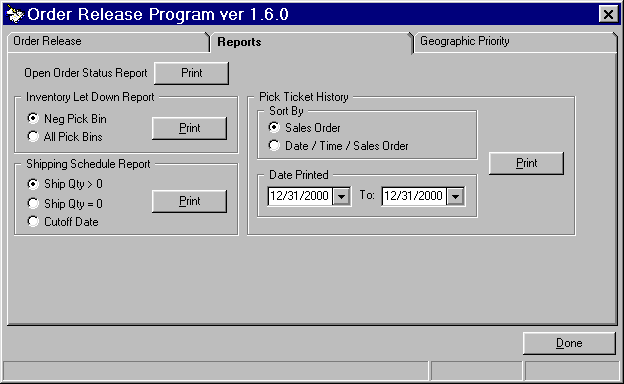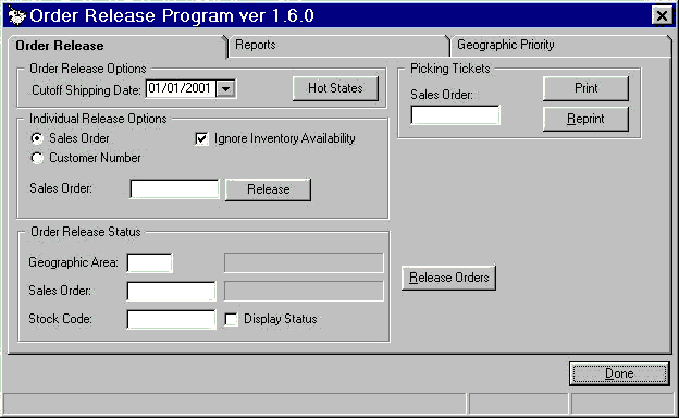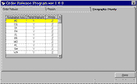 Saberware recently developed an Order Release program that works in conjunction with Encore's Impact Accounting program. The users felt that Impact's Order Release was too cumbersome for the way they release orders. We developed the Order Release program using Microsoft's Visual BASIC and Seagate's Crystal Reports to release any open orders. But, the user ships chocolates nationwide, thus they do not want to release orders to "HOT" states. I allow the user to select "HOT" states and those orders will not be released. This program checks the availability of stock on a per order basis. The user can also designate a Geographic priority in which the orders will be released and thus what stock will be consumed first. The user has the option to override and release partial shipments. Once the order(s) have been released, a picking ticket is generated for picking purposes. Key Benefits