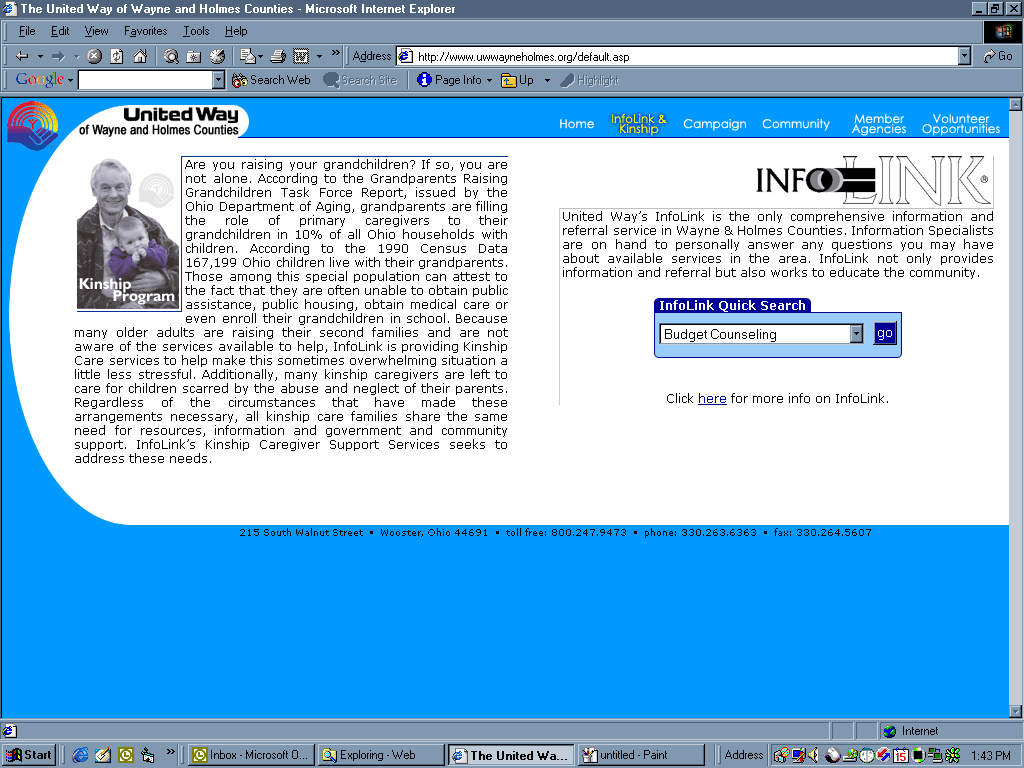 We recently created a web-site for the United Way of Wayne and Holmes County. This web-site contains a searchable database of comprehensive services available in Wayne and Holmes County. The site was designed using ASP, HTML with a Microsoft Access database as the backend. We provided a conversion process from their current software system (a Foxpro 2.6 for Windows app), which is still in use, to a Microsoft Access database that is uploaded and used in the search. We provided an application that automates as much of this process as is possible. The only manual part is the actual export from the existing software. We take this exported Foxpro data and run a conversion, cleaning up the data, compacting the database, and then finally connecting to the hosting site and uploading the new database (making backups of the old databases as we go). Main Highlights